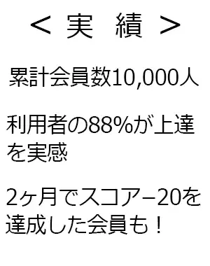 累計会員数10,000人 利用者の88%が上達を実感 2ヶ月でスコア-20を 達成した会員も! |