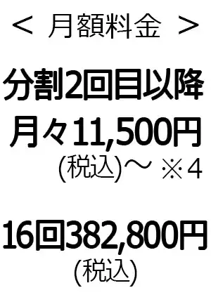 3,300円※1 | 分割2回目以降 月々11,500円(税込)〜※2 16回382,800円(税込) |