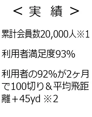 累計会員数20,000人※3 利用者満足度93% 利用者の92%が2ヶ月で100切り &平均改善飛距離+45yd※4 |