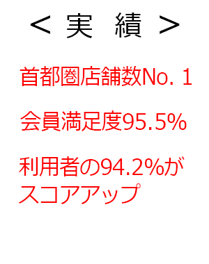 首都圏店舗数No.1 会員満足度95.5% 利用者の94.2%がスコアアップ |